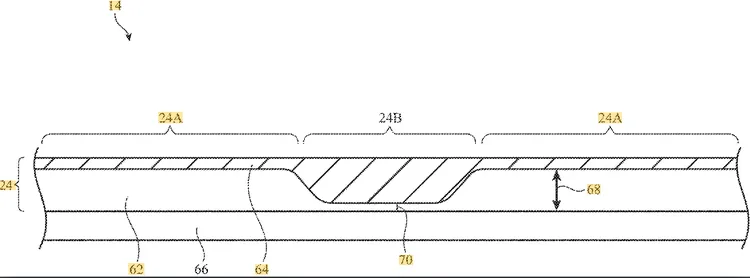 目前的折叠屏手机,为了保证弯折性能,表面覆盖的通常是 UTG(超薄玻璃)或 CPI(透明聚酰亚胺),它们虽然坚韧,但面对钥匙划痕或指甲压痕时依然脆弱。而苹果的专利描述了一种由超高韧性弹性体构成的外层覆盖物。