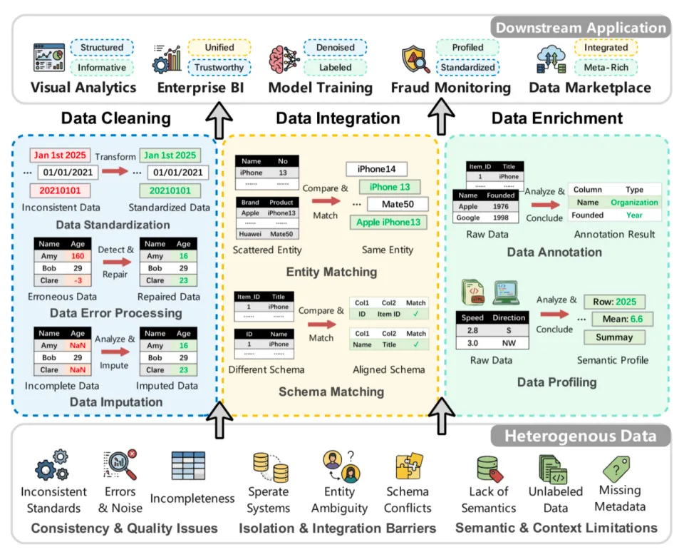研究团队指出,LLM 的引入正在推动这一流程从「规则驱动」向「语义驱动」转变。模型不再仅仅执行预设逻辑,而是尝试理解数据背后的含义,并据此完成检测、修复、对齐和补充等操作。