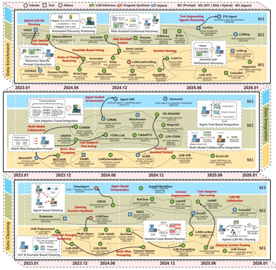 论文总结的「技术版图式」对照表(如上方表 1),将不同方法按照技术路径(基于 prompt、RAG、智能体等)与任务环节(清洗、集成、增强) 进行交叉定位。其核心价值在于帮助工程团队进行技术选型:在不同规模、成本约束与任务阶段下,应优先考虑哪类技术路线。