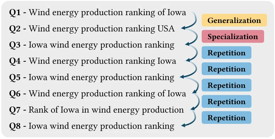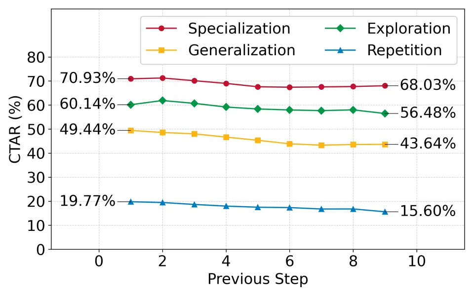 在此基础上,工作提出 “会话意图(Declarative / Procedural / Reasoning)→轨迹动作(专化 / 泛化 / 探索 / 重复)→检索信息采纳率(CTAR)” 三层分析框架,利用 LLM 进行会话切分与标签推断,刻画出智能体搜索中普遍存在的下钻偏好、事实型任务中的重试循环,以及不同改写模式对历史检索信息依赖程度的显著差异。