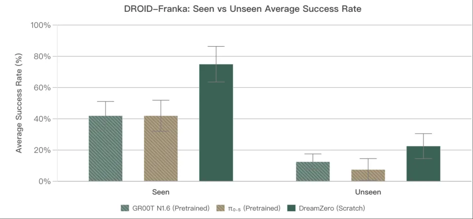 为验证在公开数据上的效果,研究团队在 DROID(最异构的开源机器人数据集之一)上训练 DreamZero,并评测 20 个已见任务与 20 个未见动词任务(DROID 中未出现的动作)。DreamZero 显著优于预训练基线,在未见动词上取得 49% 的任务进度,而最先进的 VLA 仅为 25–32%。