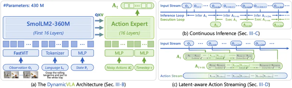 上述机制能否成立,还依赖于足够低的推理延迟。因此 DynamicVLA 采用了专为动态操控设计的轻量化架构: