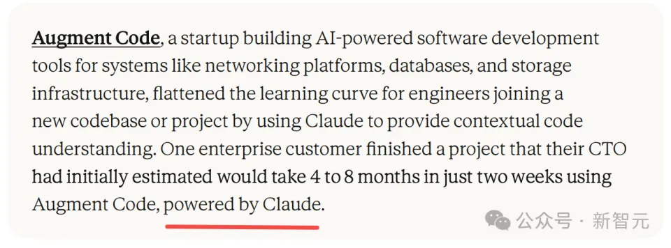 Augment Code(一家AI开发工具初创公司)的企业客户,用Claude完成了一个项目,他们的CTO原本估计需要4到8个月。最终,只花了两周。