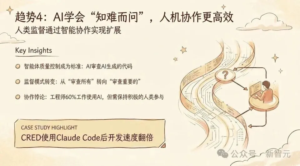 - 人类从「审查一切」转向「审查关键点」。 建立智能系统处理日常验证,只在真正新颖的情况、边界案例和战略决策时寻求人类输入。