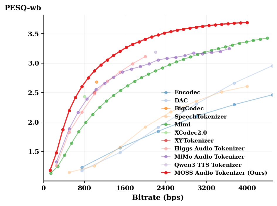 4. 语义 - 声学统一表征: MOSS Audio Tokenizer 编码得到的离散 Token 在保持 SOTA 级高保真还原音质的前提下,还蕴含了丰富的语义信息,能天然适配自回归生成模型的建模需求。