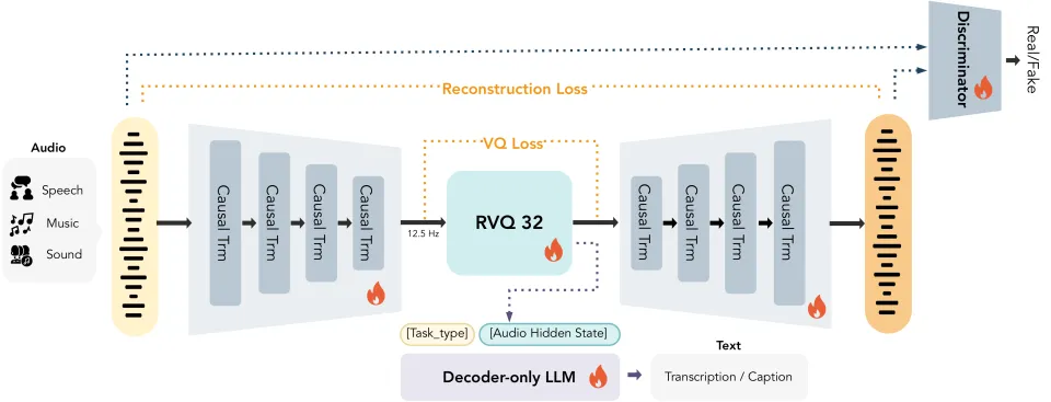 3. 通用音频表征能力: 历经 300 万小时超大规模音频数据的预训练,覆盖语音、音效、音乐等全领域,具备极强的泛化能力。
