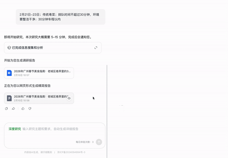 待信息补充完整后,它才开始真正的信息搜集和分析工作。最终生成的调研报告不仅罗列了三家老字号的招牌菜和价格,还直接给出预算内的配菜方案、交通路线,甚至用代码写了个 2026 春节晚餐时段避峰指南。
