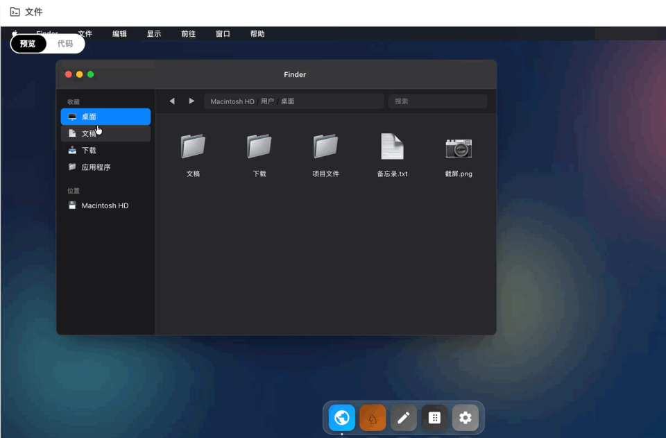 从最终呈现效果来看,这个 macOS 仿真桌面整体完成度较高,视觉结构清晰,Finder 窗口布局、侧边栏层级、面包屑导航和文件区域划分都较为准确,深色主题氛围、窗口圆角与阴影效果也较为自然,Dock 的毛玻璃质感和图标排布具有较强的还原度,整体已经达到一个可交互的高质量演示级 Demo 水平。