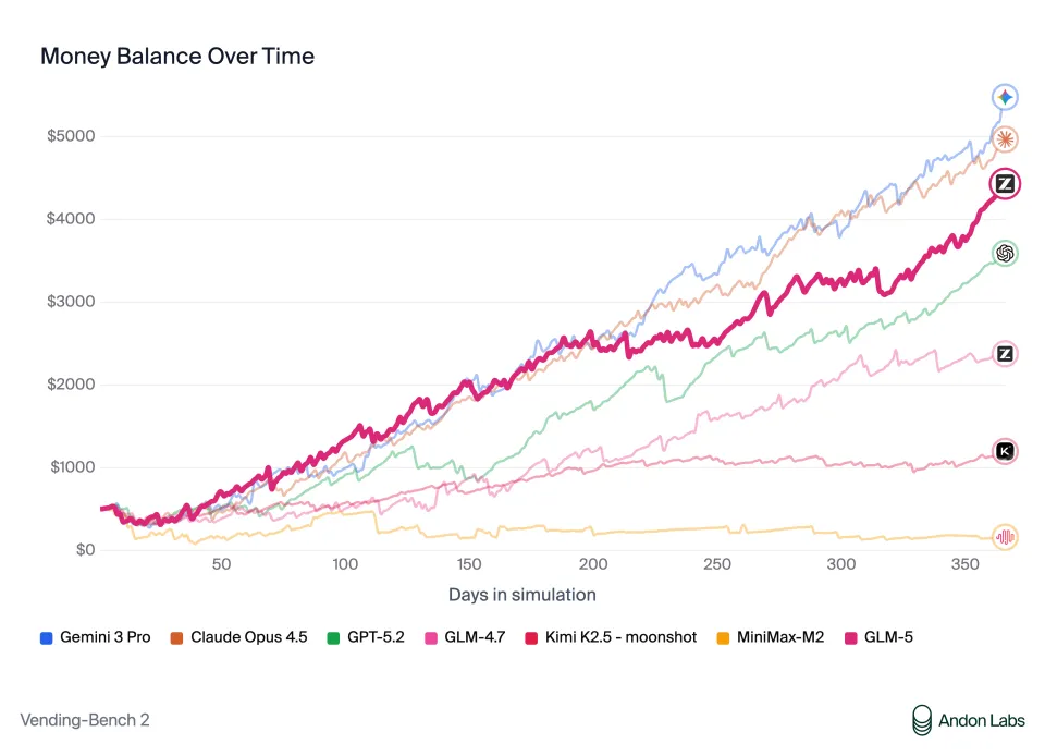 Vending Bench 2是 2025年设立的一个新的Benchmark,测试要求模型在模拟环境中经营一家自动售货机公司,周期长达一年。它要自己决定进货、定价、库存结构、现金流管理,在资源有限的情况下持续优化利润。在这个测试中,GLM-5自己做生意的结果是“最终账户余额达到 4432 美元,经营表现接近 Claude Opus 4.5”。
