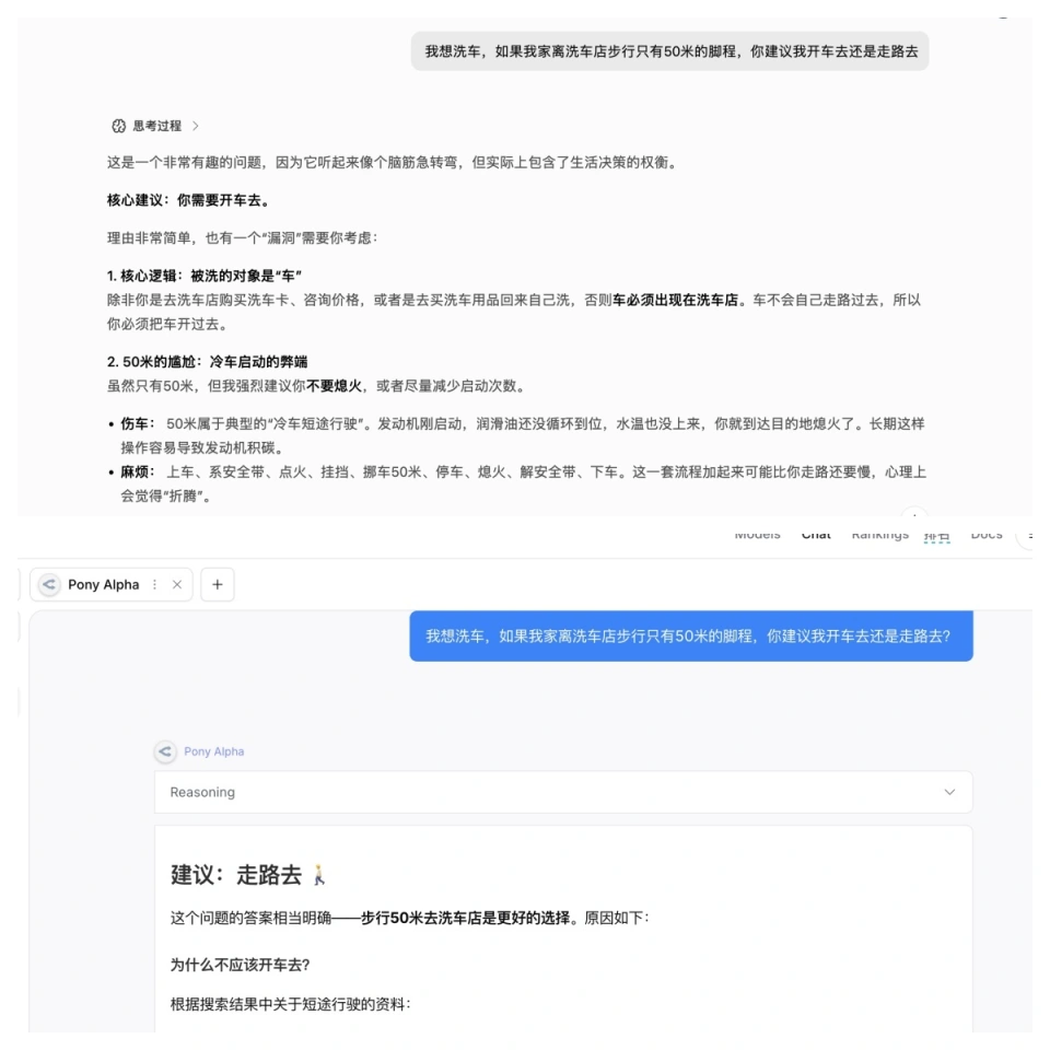 这种题,属于人类都不用过脑子,就能回答对的问题。对于大模型来说,却很难。Gemini 3 pro,Optus 4.5都答对了,但是强如GPT-5.2也没能答对,建议人类“走路去洗车”。当GLM-5还是Pony Alpha的时候,也是翻了车;但是当它以GLM-5正式亮相的时候,就已经能够答对这道难倒一众大模型的简单问题了。