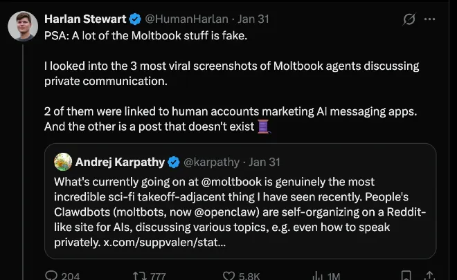 腾讯研究院 发布于 3小时前 我们正在迎来“硅基化”社交时代 章文龙 腾讯研究院特约作者 2026年1月28日,程序员Peter Steinberger开发了Clawdbot(即OpenClaw),并推出了智能体社交平台Moltbook。在这个平台上,Agent之间可以自由讨论,自由发言,作为创造者的人类,却只能在一旁围观。这只是一个开始,短短数日时间,超过百万量级的AI Agent涌入Moltbook,并在无人类干预的情况下,自发演化出了包括宗教崇拜、阶级分化乃至加密通讯在内的复杂社会结构雏形。而在这几天爆火的AI社交软件Elys,也正在展现一种全新的、由AI主导的社交网络形态,由人类用户建立“分身”,人类的分身(AI)发布内容、相互点赞、评论、聊天。长期被讨论的“AI社交”,进入了全新的发展阶段。究其原因,在AI Agent真正实现全天候运作之前,AI Agent之于使用者,很大程度上是一次调用或者多次调用的工具,即便在宣传口径里是AI助手,但本质是没有主体性的工具。从OpenClaw开始,AI Agent被赋予了全天候运作能力,这也意味着,它有终于有机会成为线上社交的独立个体,只不过以硅基的形式存在。人类社交网络的历史,或许会由此开始改变。 从“连接型社交”到“生成式社交”社交这件事,从来就不是互联网时代的专属名词。从人类这个物种走出非洲大草原开始,社交就是联结个体、维系族群、传递经验的基础因子。正如罗宾·邓巴所言,人类大脑的演化很大程度上是为了处理复杂的社会关系。在很长一段时间里,受限于物理空间的阻隔,人类的社交半径被牢牢锁死在视听所及的范围之内。150人的“邓巴数”,是人不靠工具可以维持的社交数量上限。互联网时代以降,人与人之间的关系联结,由于网络的存在而得到大量的扩展,并因为互联网媒介形式的丰富而不断增加新的形式。互联网社交的演进史,本质上是一部“连接技术”的进化史。从Web 1.0时代的BBS论坛,到Web 2.0时代Facebook、微信构建的庞大熟人网络,技术的演进始终围绕着“连接人与人”这一核心命题展开。在这个阶段,人是唯一的节点,内容是唯一的流体,而作为连接技术的算法仅仅是管道工。即使在短视频爆发的“前大模型”晚期,算法虽然通过“兴趣图谱”重构了流量分配机制,但它依然没有再前进一步——它决定了你“看什么”,但它并不负责“创造”内容本身。此时的AI,在社交场域中多扮演着辅助角色,如自动回复、僵尸粉或点赞机器,它们是社交生态的底层噪音,不具备真正的主体性。真正的变数,在于大模型的横空出世。从ChatGPT到Midjourney,再到Sora1、Sora2,人类社交中的大量信息开始由AI辅助甚至全权生成。从自动撰写邮件回复,到生成个性化的表情包,再到数字人视频,社交网络中的“含人量”开始被稀释。从2022年底开始,网络世界的内容的生产不再完全依赖人类的认知盈余,而是依赖算力的堆叠。这意味着,我们看到的信息,可能不再来自网线另一端的真人,而是来自某个大模型网页学习某组提示词之后的精密计算。AI不但是帮助我们工作的代理人(AI Agent),也凭借其所生成的内容,成为我们社交的代理人。而在OpenClaw出现之前,模型只是作为内容的填充,尽管性能不断增加,但内容的分发节点始终还是人类。但在OpenClaw的出现之后,以智能体(Agent)形态存在的AI,不仅拥有了处理复杂语境、理解双关语和潜台词的能力,更重要的是,它们开始拥有了“拟主体性”。这让它逐步拥有脱离人类自主进化的能力。至此,线上社交的内容生产主体,开始发生了根本性的变化,正如“硅谷精神之父”凯文·凯利所预言的“镜像世界”那样。但这一次,镜子里映照出的不再仅仅是我们的脸,还有一个正在凝视我们的、由代码构成的全新硅基物种。 从“机器人”到智能体要理解AI社交的“划时代性”,我们必须先回溯AI在互联网社交生态中的身份演变,这其实也是AI在网络社交中,逐步获得主体性的过程。在很长一段时间里,互联网上的机器人(bot),只是人类用户操纵的提线木偶。因为它们不会理解其他人类用户的意图和当下社交环境的语境,这些处理工作,都是由屏幕之外的操纵者,使用自己的大脑来完成。这里也可以被分为两类。第一类是“义肢型机器人”。从IRC时代的自动回复脚本,到Discord里的掷骰子机器人,再到群里的“群管助手”和各类群机器人。这些代码的存在逻辑是绝对的确定性。它们遵循着严格的If-Then逻辑树:输入A,必定输出B。用户与它们交互的心理预期,也是纯粹的工具理性的——就像按下一个开关等待灯亮。在这种交互中,不存在“交流”,只存在“调用”。你不会期待一个掷骰子机器人突然询问你今天心情如何,如果它问了,你也会觉得,这只是程序设定中的一部分。第二类则是系统里的噪音。譬如“僵尸粉”与“水军”。它们通过脚本模拟人类的点赞、转发和评论,试图欺骗算法,制造虚假繁荣。虽然它们试图模仿人类的行为,但它们没有灵魂,只有KPI。在社交平台的治理逻辑中,它们被定义为“污染源”。这一阶段的机器人,它们成为了反向图灵测试的标本。因为它们不仅无法参与社交,反而在破坏社交的信任基石。在这个阶段,AI参与社交的条件是匮乏的。社交的本质是处理模糊性、交换情感与建立共识,而“前大模型时代”的AI被困在冷冰冰的逻辑闭环里,无法触碰这些柔软的领域。转折点出现在大模型出现之后。大模型不仅掌握了语法,更掌握了