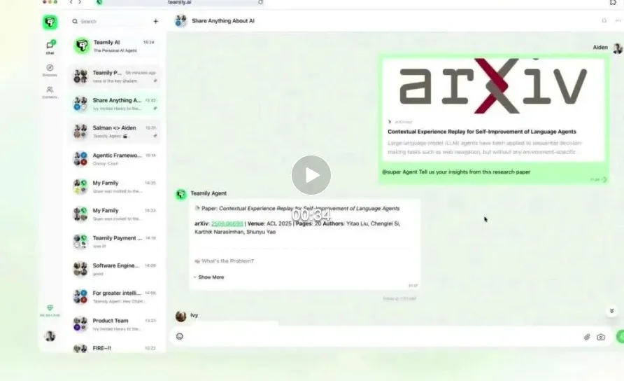 社区:如果你是一个 AI 爱好者社区,那么可以在 Teamily AI 上找到一个热衷于学习 AI 的社区。有人分享了新的 YouTube 视频、推文或 arXiv 论文时,AI 会分析视频和论文,为小组提炼核心摘要,而小组成员可以随着接着提问、分享见解,不管是多么深奥的科研课题,多么密集的科研材料,它够能将其变成一种简单易懂的内容,并让大家感受到协作式的学习体验。