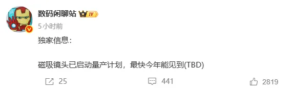 据知名数码博主爆料,小米的磁吸镜头项目已启动量产计划,极有可能随 2026 年的小米 MIX 5 或 16 Ultra 正式推向市场。