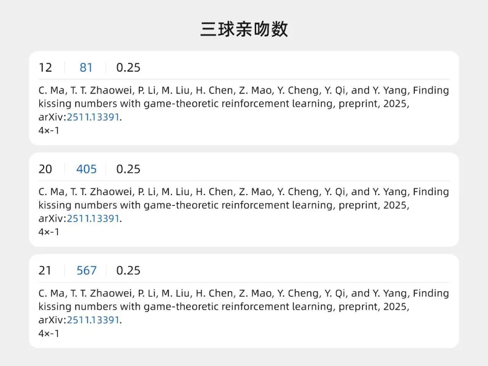 打破 12 维、20 维、21 维「三球亲吻数」纪录;