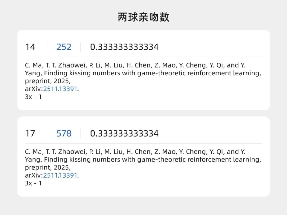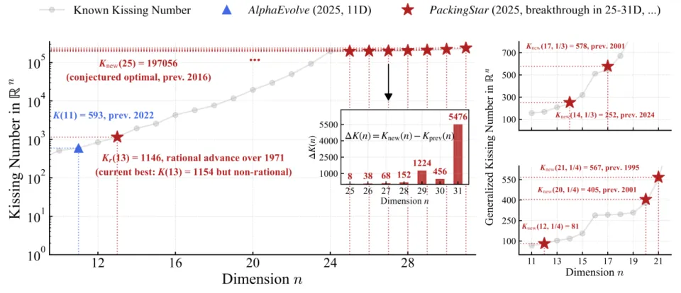 如今,上海科学智能研究院(下称上智院)联合北京大学、复旦大学研发设计的 PackingStar 强化学习系统,在 12、13、14、17、20、21、25–31 维等多个维度刷新亲吻数与广义亲吻数纪录,实现数学结构领域罕见的多维度、系统性突破。