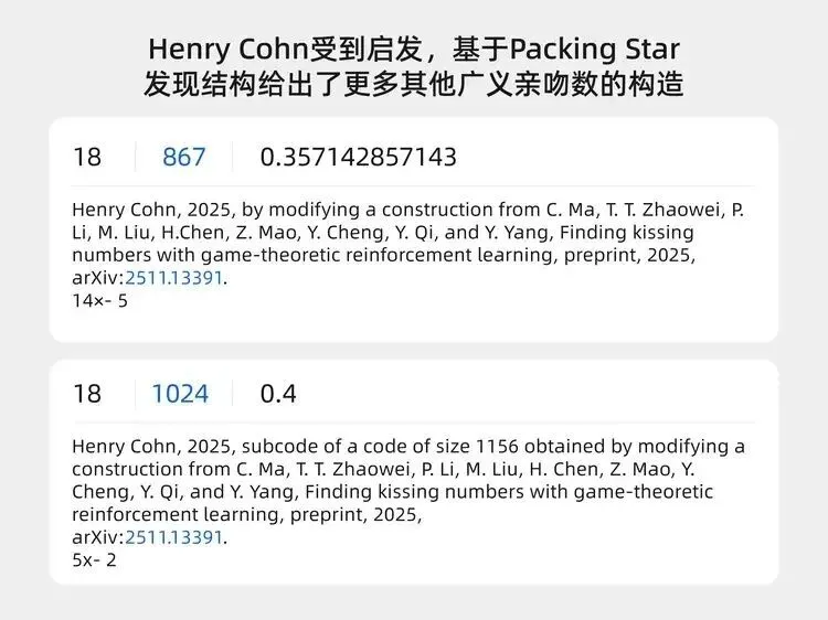 这些成果获得麻省理工学院教授、离散几何领域权威 Henry Cohn 高度评价,并被收录至其维护的权威榜单。Cohn 在 Packing Star 发现的结构基础之上,自己又打破了两个维度的广义亲吻数纪录。