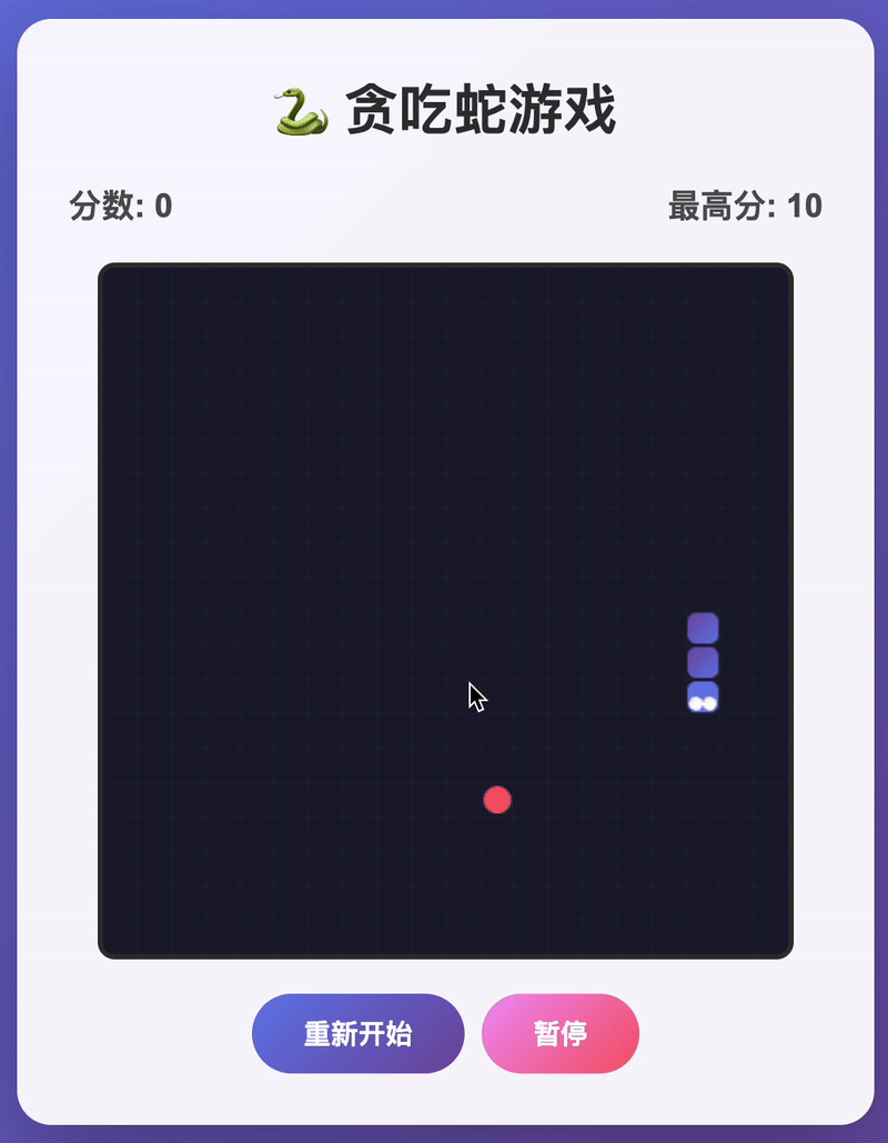它生成的经典贪吃蛇小游戏,也实现了流畅的移动逻辑和碰撞检测,还加入实时得分系统。