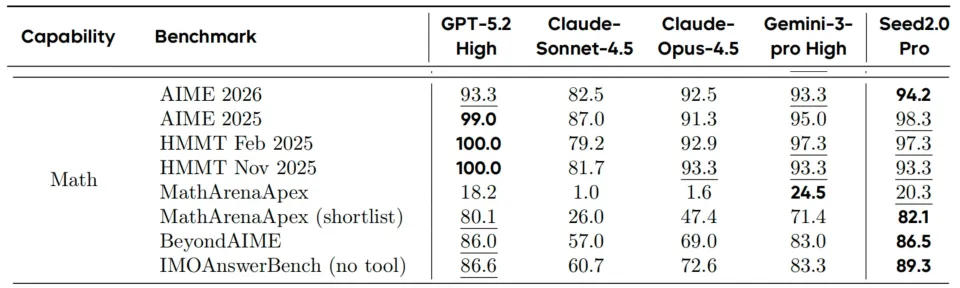 在推理和 Agent 能力评测中,豆包 2.0 Pro 在 IMO、CMO 数学奥赛和 ICPC 编程竞赛中获得金牌成绩,也超越了 Gemini 3 Pro 在 Putnam Bench 上的表现。