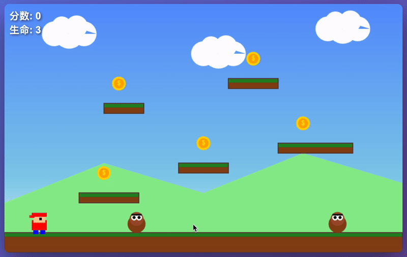 画面设计精美细致,模型完整实现游戏核心机制,左上角实时显示分数和生命数,整个游戏从 UI 设计到交互逻辑都达到了可发布水平。