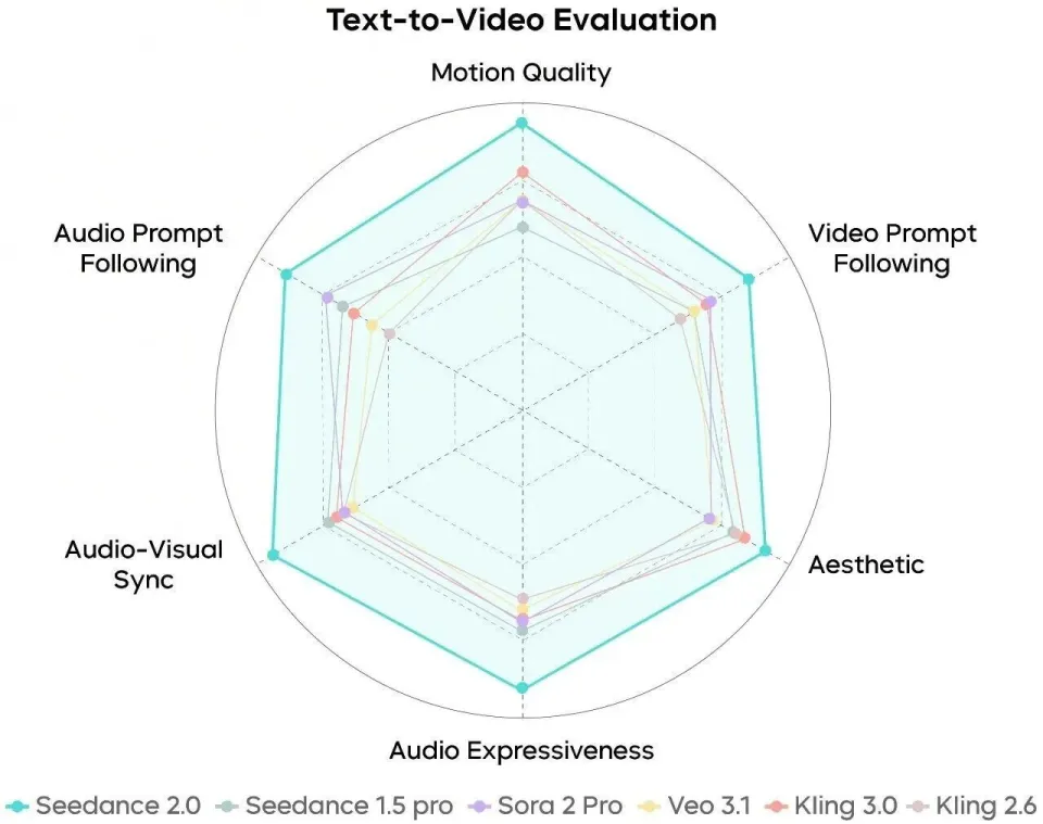 在评测表现上,Seedance 2.0 的视频能力处于业内领先水平,该模型可精准呈现高张力大动作与精细的微表情,并支持专业级组合运镜与叙事节奏控制。音频维度上,Seedance 2.0 针对中文方言、戏曲及演唱场景,其指令响应准确度明显提升。