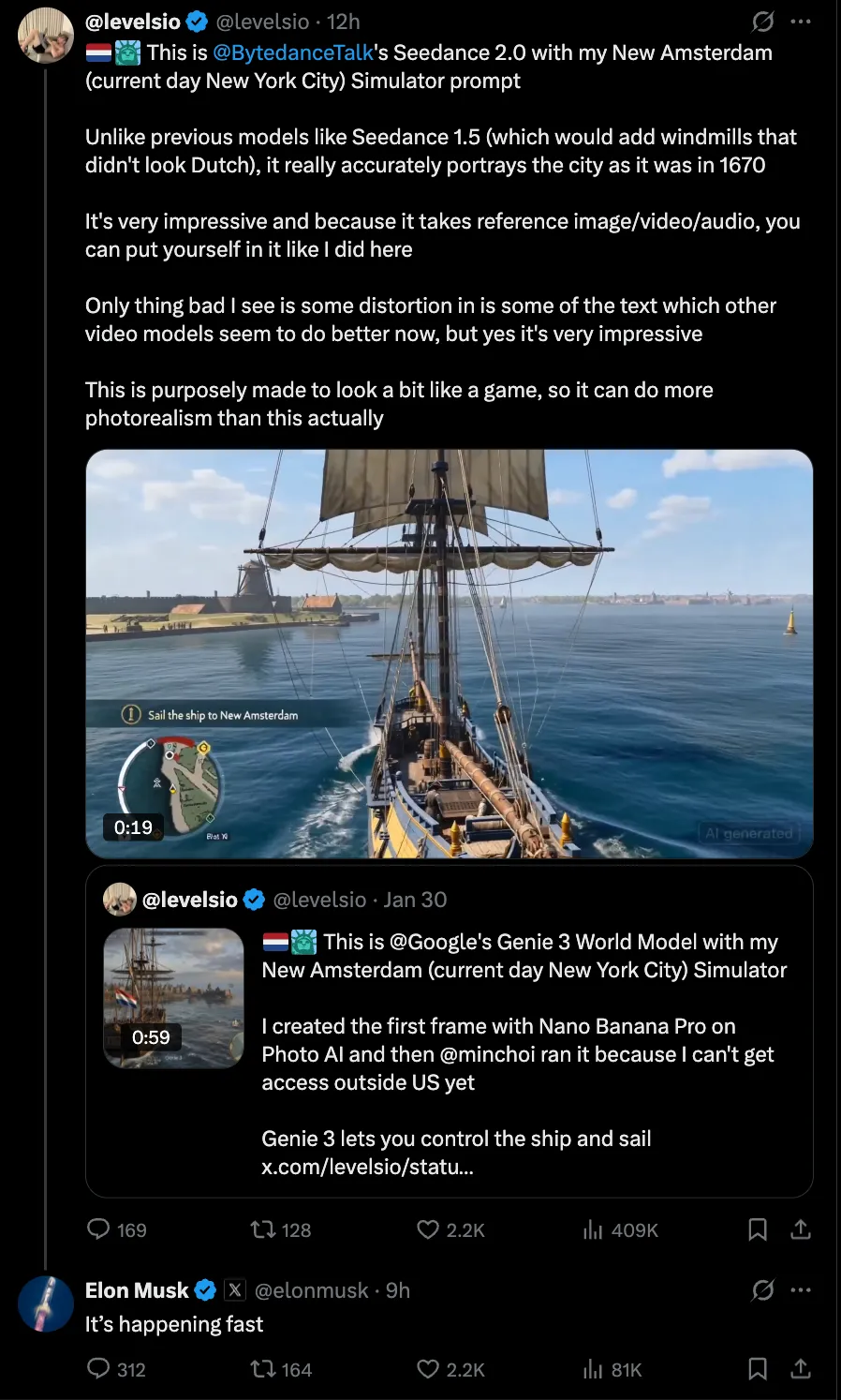国内外一片好评。有网友用 Seedance 2.0 模拟 1670 年的新阿姆斯特丹,效果惊艳,连马斯克都在底下评论「It’s happening fast.」