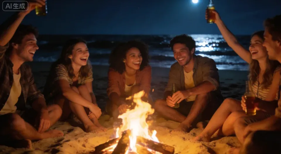 Prompt:A low-light digital picture captures a group of friends laughing around a bonfire on a sandy beach at night. The firelight illuminates their faces while the ocean is dark in the background.