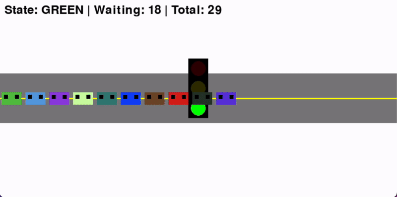 每辆车被赋予不同色彩以增强视觉辨识度,交通信号灯在红绿状态间自动切换,车辆严格遵循「红灯停、绿灯行」规则。