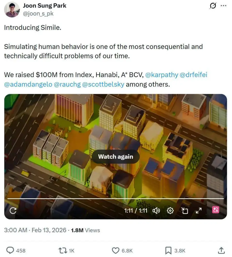 刚刚,论文作者之一 Joon Sung Park 也在 X 上正式官宣了 Simile 的成立,并披露公司已完成 1 亿美元融资。投资人包括李飞飞、Andrej Karpathy 等众多 AI 大佬。