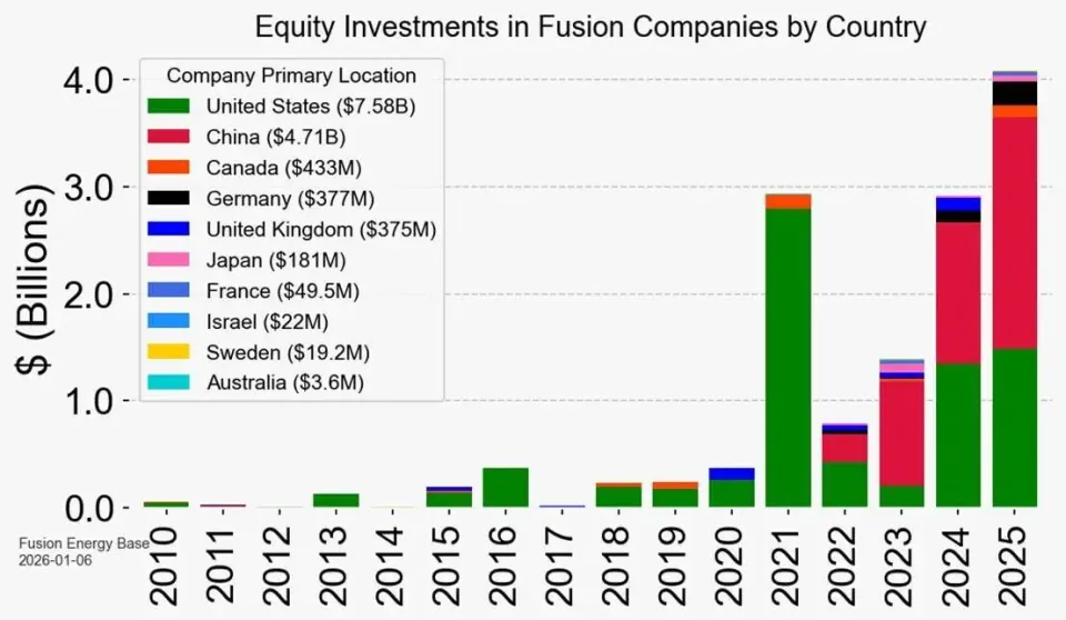 既然已经进入比拼工程能力的早期阶段,那么,在中国,产业政策的飞轮也毫无意外地再次快速转动。最近,“星环聚能落地上海暨融资签约仪式”的报道,充分释放了各地抢人、抢企业这样令人熟悉“内卷”信号。除了去年挂牌成立的“国家队”中国聚变能源有限公司外,上海目前还拥有能量奇点、诺瓦聚变、东昇聚变等聚变企业,及其供应链企业翌曦科技、超磁新能等。近三年来,中国在核聚变领域的融资金额,持续超越美国,累计融资额逐步接近。
