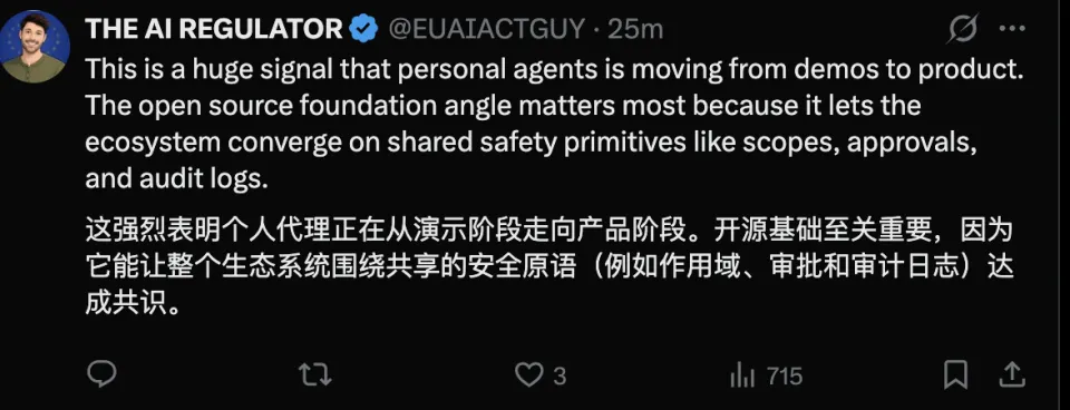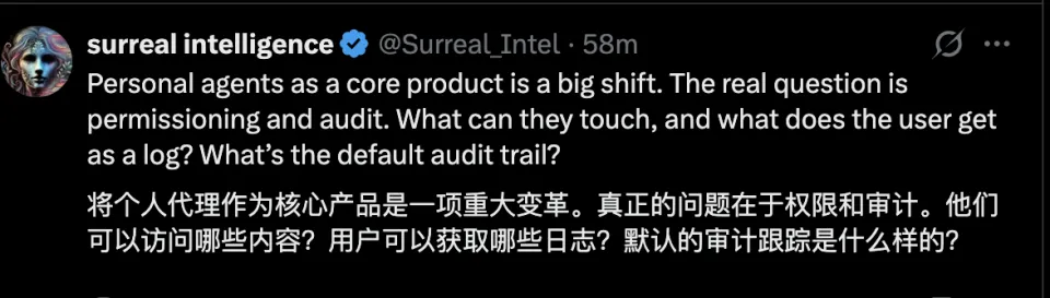 有网友指出,将“个人代理”作为核心产品形态,本身就是一次重大的产品范式转变,而真正的难点并不在能力本身,而在制度设计:代理究竟可以访问哪些数据?用户是否能够完整查看操作日志?默认的审计追踪机制是否足够细粒度、可回溯?