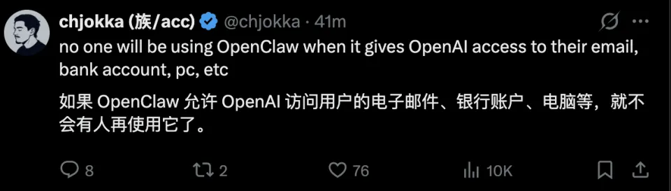 在 x 上,一部分用户首先对权限边界问题表达了明确担忧。有网友直言,如果 OpenClaw 未来允许 OpenAI 访问用户的电子邮件、银行账户甚至个人电脑,那么这个产品将很难被真正采用,“几乎不会有人愿意继续使用它”。在他们看来,个人智能体一旦深入到高敏感数据层,其风险将远高于传统聊天式模型。