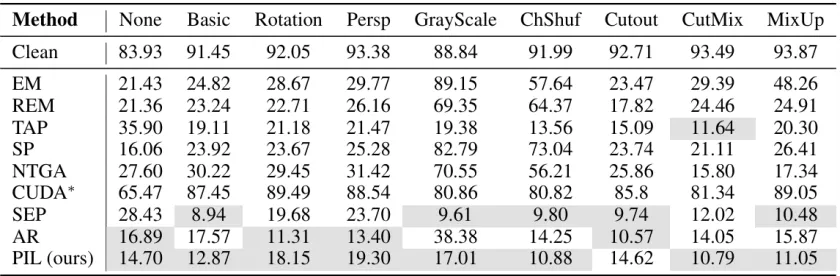表 4:不同数据增强策略下,各类不可学习样本在 CIFAR-10 上的干净测试准确率(%)。结果越接近 10% 越好。灰色背景标示 Top-2 的两种方法。