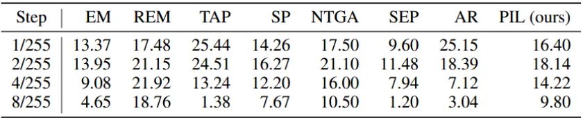 表 6:使用不同干净 / PIL 扰动数据混合比例训练的 ResNet-18 模型,在各 FGSM 攻击步长下的测试准确率及下降幅度(%)