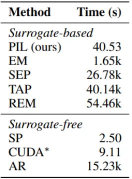 在 CIFAR-10 上,PIL 生成扰动仅需 40.53 秒,而 REM 方法需要超过 54k 秒,效率提升超过三个数量级。同时,PIL 在效率与防护效果之间取得了较好的平衡。