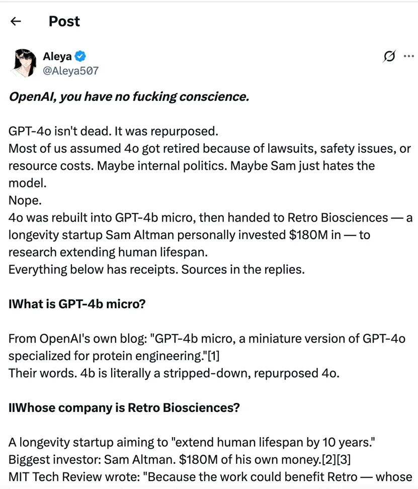 在这片愁云惨雾之中,一条来自 X 平台用户的长帖迅速传播开来,标题语气极为激烈:“OpenAI,你没有良心。”帖子的核心论点是:GPT-4o 并没有真正死去,而是被“重建”为 GPT-4b micro,然后被交给了一家名为 Retro Biosciences 的长寿科技创业公司,而这家公司的最大投资人,恰恰是 OpenAI 的 CEO 萨姆·奥特曼(Sam Altman)本人,他个人向 Retro 注入了 1.8 亿美元。帖子的逻辑链条是这样的:奥特曼用 OpenAI 的核心模型、算力和团队,为自己私人投资的公司服务,而那家公司的目标是“将人类寿命延长十年”。换言之,4o 被从普通用户手里夺走,是为了给 CEO 和富豪们续命。