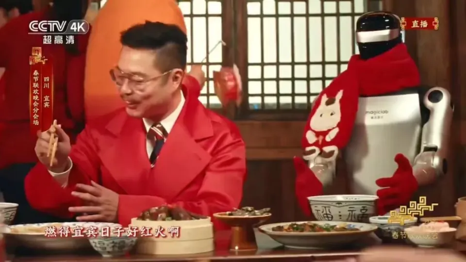 春晚还首次迎来了人形机器人多机协作,Gen1 化身“赛博捞面师”,完成捞面、起面、倒面等连续操作;Z1 则以“赛博送餐员”身份登场,为魏翔端上具有当地特色的燃面。