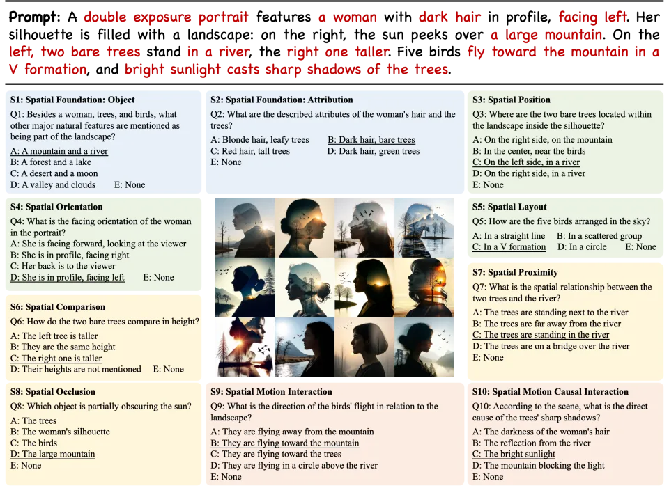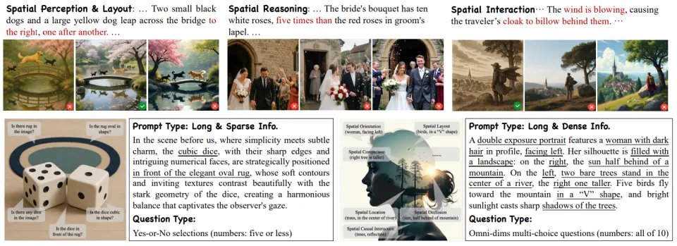 该基准测试覆盖自然、室内、户外、人类活动及艺术设计等 25 个现实世界场景,为其精心构建了 1,230 条 长文本、信息密集型提示词。每个提示词均深度融合了上述从基础属性、布局到高阶遮挡、因果推理等 10 个空间子领域及对应全维度问答。值得注意的是,每个提示词长度约 60 词,允许同时兼顾依赖 CLIP 编码模型(77 tokens 限制)和保持高度信息密集。