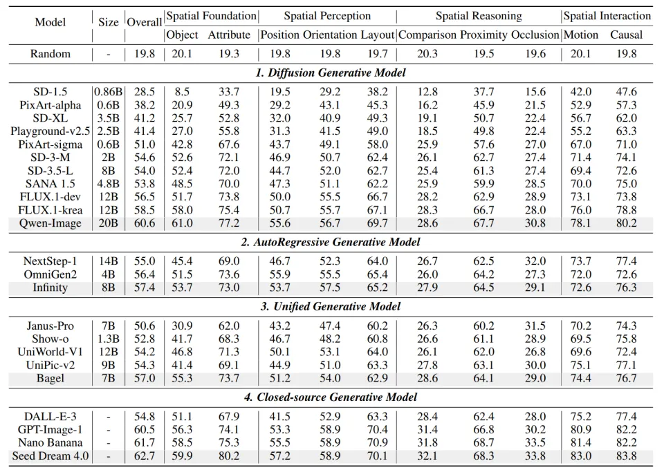 开源模型正快速追赶:评测显示,最强的开源模型 Qwen-Image (60.6%) 表现已与顶级闭源模型 Seed Dream 4.0 (62.7%) 基本持平,但均仅达到及格线水平,空间智能仍有巨大提升空间。