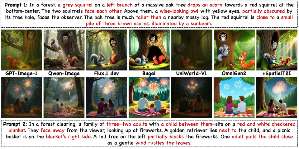 尽管目前文生图模型(Text-to-Image Models)在生成高保真图像上表现卓越,但在应对空间感知、空间逻辑推理及多目标空间交互等贴合现实场景的复杂空间智能任务时往往力不从心。现有评估基准主要依赖简短或信息稀疏的提示词,难以覆盖复杂的空间逻辑,导致模型在这些关键空间智能维度上的能力缺陷被严重低估。