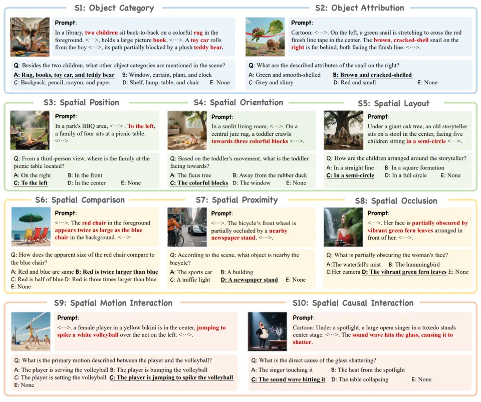 1. 空间基础 (S1/S2):多目标物体类别(S1)、多目标属性绑定(S2)。