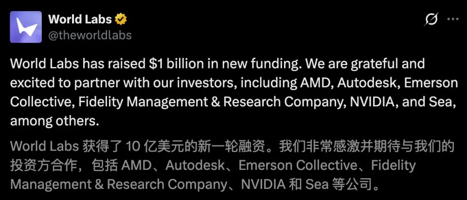 就在刚刚,李飞飞「明星初创」World Labs官宣:成功斩获高达10亿美元的全新一轮融资。