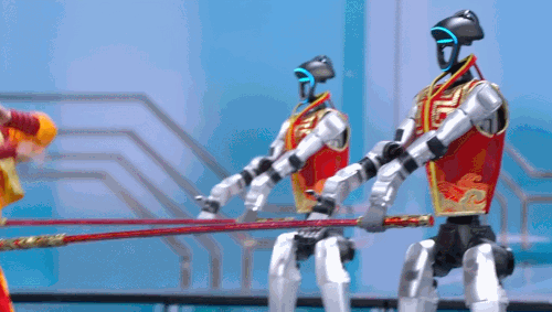 再往下,手中的棍棒、双节棍与单手剑,对戏的武术小演员,一切对外部扰动和物理状态的实时感知,机器人的 AI 大脑都做到了自适应。