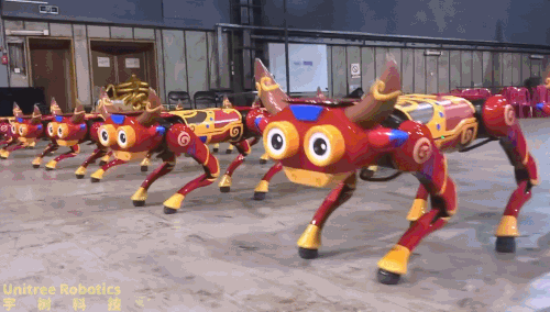 这是 2021 年春晚上,宇树「机器牛」的集群舞:
