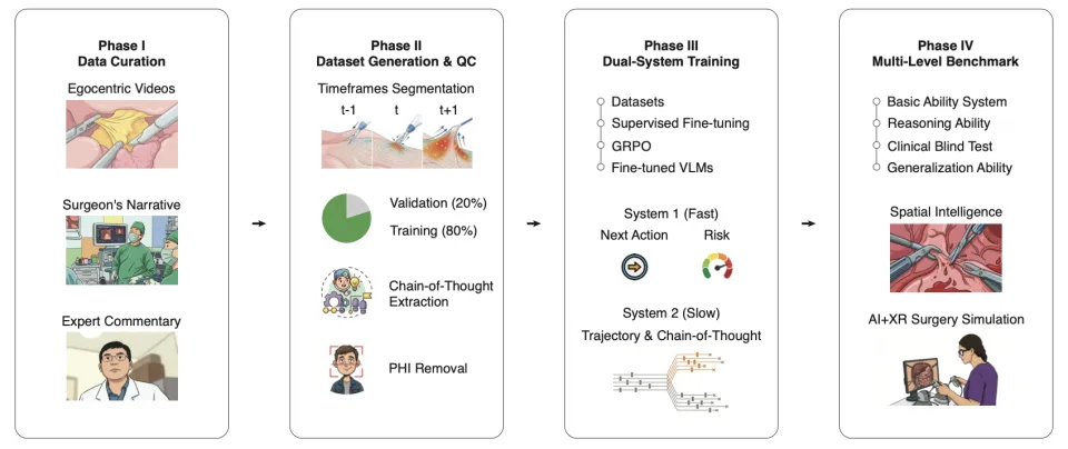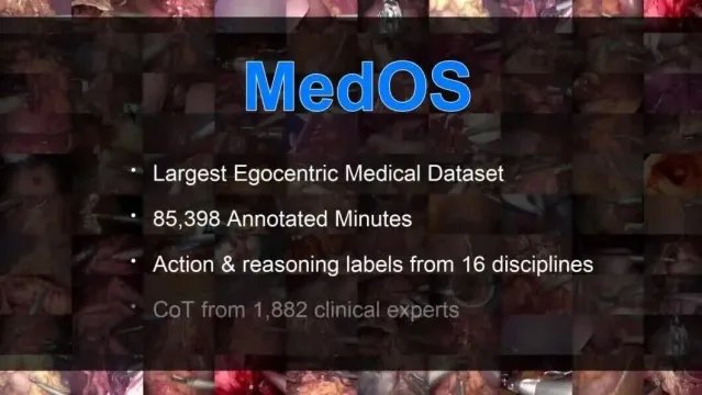 为了训练MedOS,团队构建了MedSuperVision——迄今为止规模最大的开源临床视觉数据集,包含了85,398分钟的高保真医疗影像与操作数据,这不仅涵盖了外科视野,更通过海量数据让模型学会了人体组织在各种干预下的动态反馈。 正是这种对医疗物理学的底层理解,让MedOS拥有了跨科室的通用能力。