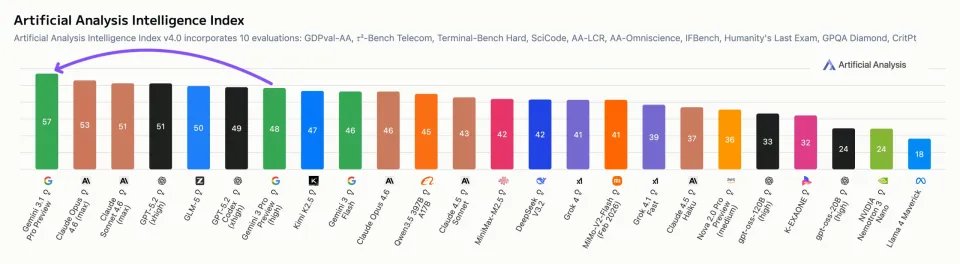 来自第三方公司 Artificial Analysis 的评估表明,谷歌的 Gemini 3.1 Pro 已经跃居榜首,再次成为世界上功能最强大、性能最佳的 AI 模型。