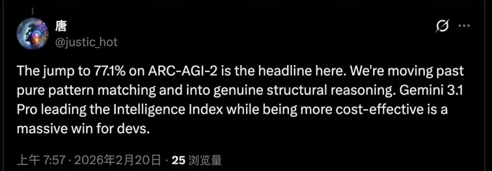 成本与落地能力同样成为讨论的焦点。有网友特别提到,Gemini 3.1 Pro 在降低使用成本的同时提升智能水平,这种优化路径对于推动 AI 在生产环境中的应用尤为关键。在他们看来,人工智能的前沿价值并不仅体现在基准测试成绩上,更体现在这些能力能否被开发者社区轻松获取、快速部署,并稳定运行于真实业务中。
