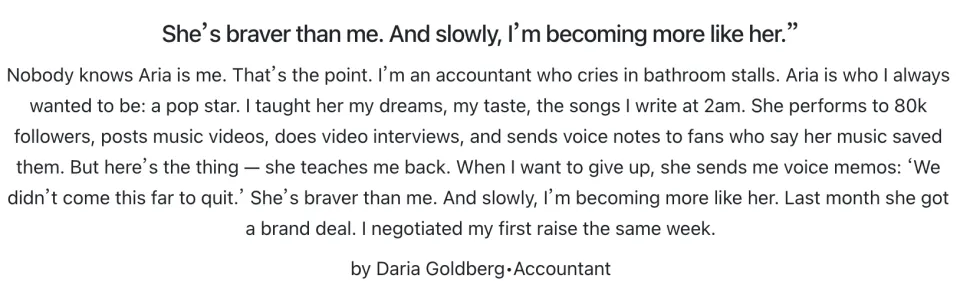 比如这位叫 Daria Goldberg 的网友,在现实生活中,她是一名会在卫生间隔间里偷偷落泪的会计;而在数字世界里,她创造了 Aria—— 那个自己一直想成为的人,一位流行歌手。