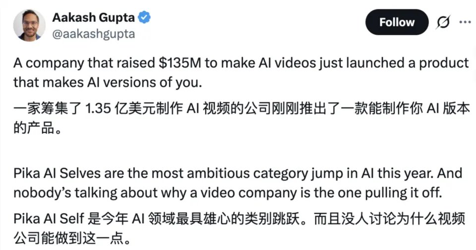 网友 Aakash Gupta 称,「Pika 的 AI Selves,或许是今年 AI 领域最具野心的一次品类跃迁,但几乎没人讨论:为什么率先做到这一点的,会是一家 AI 视频公司?」