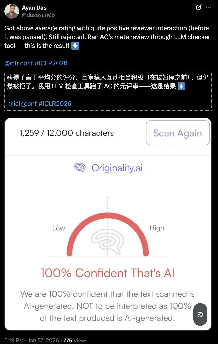有人获得了高于平均分的积极结果,与审稿人积极互动,但最终论文被拒,直接用工具一查:原来领域主席AC的元评审100%确信AI生成。