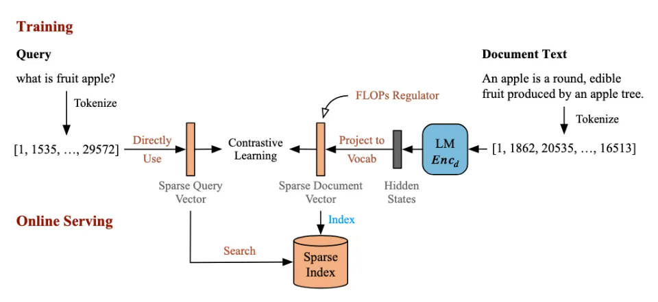 同样通过端到端对比学习,通过 Doc 侧的 LLM,学习类 SPLADE 方法的 TF-based (Term Frequency-based)稀疏向量。